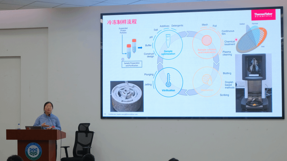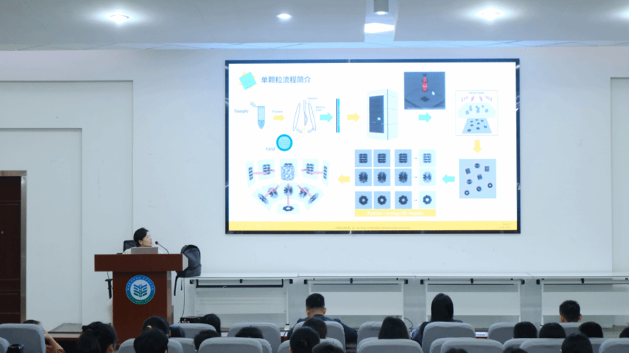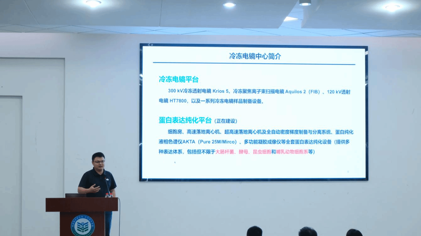 本次培训特邀业界顶尖技术团队专家,围绕冷冻电镜中心运行规范、蛋白样品制备、数据采集与三维结构解析等核心内容系统授课,直击样品纯化、冷冻制样、数据处理等科研“卡脖子”环节。培训首日聚焦平台规则、样品制备与技术基础。中心主任曹海雷作开班致辞,冷冻电镜中心负责人谢国辉详细讲解仪器使用、机时申请、收费标准及上机规范;蛋白纯化技术专家深入讲解高难度蛋白表达纯化策略与AKTA系统高级应用;电镜技术专家系统介绍冷冻电镜原理、硬件架构及EPU软件自动化数据收集流程,覆盖负染初筛、冷冻样品制备、参数优化等关键实操要点。次日围绕数据计算、现场演示与项目答疑展开。结构解析专家从图像预处理、颗粒挑选、2D分类到三维重构,完整讲授蛋白及复合物高分辨率结构解析流程。在课题组面对面环节,专家团队为师生提供蛋白纯化、制样、数据处理等问题的精准答疑,针对性解决科研瓶颈。
