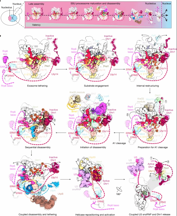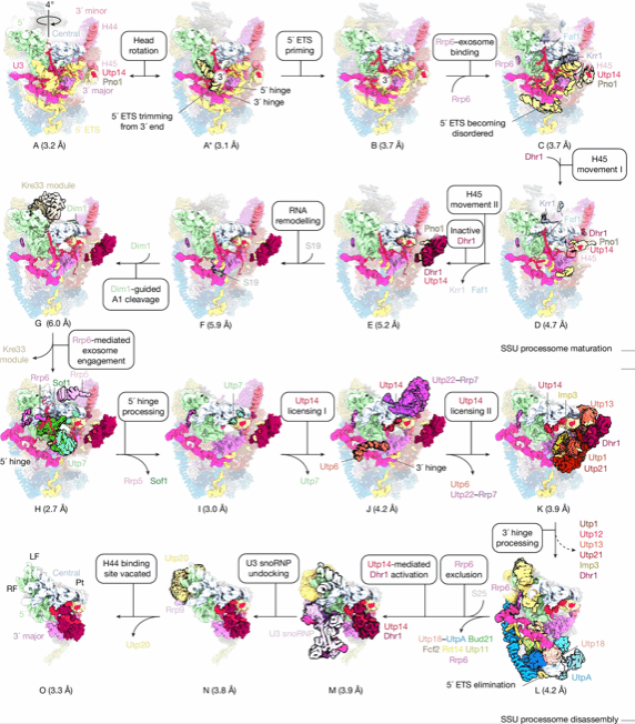真核核糖体小亚基 (SSU) 组装需要 SSU 突起组,这是一种含有 RNA 伴侣 U3 小核仁 RNA (snoRNA) 的核仁前体。由于缺乏中间体,SSU过程组成熟、重塑、分解和RNA质量控制的潜在分子机制以及状态之间的转变仍然未知。