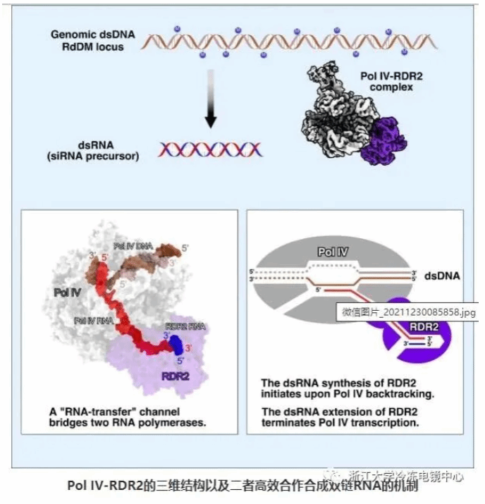 2021年12月24日,中国科学院分子植物科学卓越创新中心张余研究团队和王佳伟研究团队以及浙江大学基础医学院冯钰团队合作在《科学》上发表题为“Pol IV and RDR2: A two-RNA-polymerase machine that produces double-stranded RNA”的研究论文,该研究首次解析了植物Pol IV的结构,揭示了植物Pol IV-RDR2两种RNA聚合酶组装成的独特复合物构造,并提出了Pol IV-RDR2以底物内部传递的机制实现双链DNA为模板合成双链RNA。