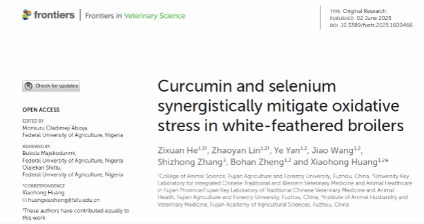 2025年6月2日,我校黄小红教授团队在《 Frontiers in Veterinary Science 》期刊上发表题为“ Curcumin and selenium synergistically mitigate oxidative stress in white-feathered broilers ”的研究论文,为家禽氧化应激反应研究提供了重要科学依据。