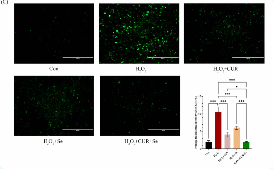 研究表明,CUR和Se协同增强了DF-1细胞的抗氧化能力;进一步发现,CUR和Se提高了肉鸡肝脏和心脏组织中的总抗氧化能力和超氧化物歧化酶(SOD)活性,降低了乳酸脱氢酶(LDH)和丙二醛(MDA)水平,从而减轻了Dex诱导的肝脏和心肌损伤肉鸡心脏损伤以及肝细胞凋亡;此外,协同处理后的肝脏和心脏中IGF-1、PI3K-p110β、磷酸化AKT和磷酸化mTOR的蛋白表达水平明显增加。