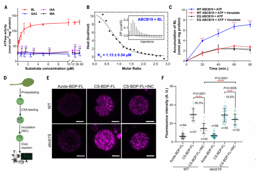 为了进一步证实ABCB19蛋白与油菜素内酯的相互作用,研究团队利用等温滴定量热法(ITC)测定了它们之间的结合亲和力。结果显示,ABCB19蛋白与活性油菜素内酯的结合亲和力在微摩尔范围内,且结合过程主要由熵变驱动。此外,ABCB19蛋白与不同种类的活性油菜素内酯(如24-表油菜素内酯、24-表油菜甾酮)的结合亲和力也存在差异,这可能与油菜素内酯分子的具体结构有关。