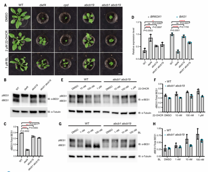 为了进一步证实ABCB19蛋白在油菜素内酯信号传导中的作用,研究团队还进行了遗传分析。结果显示,abcb19单突变体和abcb1abcb19双突变体表现出油菜素内酯信号减弱和对油菜素内酯及其前体不敏感的表型。而过表达ABCB1或ABCB19的植株则表现出增强的油菜素内酯信号。这些结果一致表明,ABCB19蛋白在油菜素内酯信号传导中确实发挥重要作用。