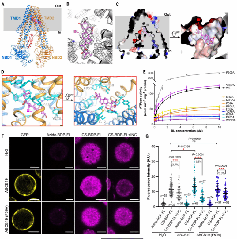 为了直接证明ABCB19蛋白能够转运油菜素内酯,研究团队进行了基于脂质体的体外转运实验和拟南芥原生质体的体内转运实验。在体外实验中,ABCB19蛋白能够显著促进[³H]标记的油菜素内酯在脂质体中的积累,且这种积累依赖于ATP的水解。在体内实验中,利用生物正交化学方法标记的油菜甾酮(CSA)在表达ABCB19蛋白的拟南芥原生质体中的积累量也显著高于对照组。这些结果一致表明,ABCB19蛋白确实具有转运油菜素内酯的功能。