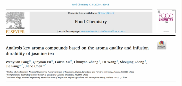 2025年1月,我校陈杰博老师团队在《 Food Chemistry 》期刊上发表题为“ Analysis key aroma compounds based on the aroma quality and infusiondurability of jasmine tea ”的研究论文,为茉莉花茶茶汤风味溶出和耐泡性评价提供了重要科学依据。