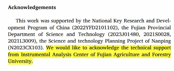 校内用户使用中心仪器设备获得的测试数据,论文中标注仪器型号,且论文的第一单位是福建农林大学,并在论文致谢中标注有“致谢福建农林大学分析测试中心(Instrumental Analysis Center of Fujian Agriculture and Forestry University )”字样,或文章署名中有中心工程师,根据所发表论文期刊水平,中心给予不同的测试费奖励。