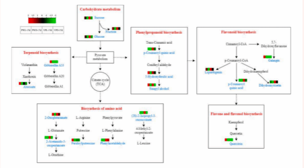 本研究持续追踪了在真空包装和塑料包装中储存15天的鲜切甘蔗,红光和蓝光处理对其生理品质、微生物负荷量、氧化还原状态和代谢组学特性的影响。结果表明,光照协同真空处理会延缓pH值的降低,同时引起呼吸速率和微生物负荷量的增加,从而增强其抗氧化能力和相关酶的活性。光照处理有利于O2的产生,但对O2-、H2O2和丙二醛的影响则截然相反。O2-和H2O2与CAT、蔗糖、果糖、葡萄糖、2-氧代谷氨酸盐、甘草素和二氢杨梅素呈负相关,与PPO和丙二醛呈正相关。只有苯乙醛与O2呈负相关。糖类、氨基酸和类黄酮的生物合成是鲜切甘蔗氧化应激的主要代谢途径。