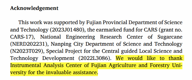 校内用户使用中心仪器设备获得的测试数据,论文中标注仪器型号,且论文的第一单位是福建农林大学,并在论文致谢中标注有“致谢福建农林大学分析测试中心(Instrumental Analysis Center of Fujian Agriculture and Forestry University )”字样,或文章署名中有中心工程师,根据所发表论文期刊水平,中心给予不同的测试费奖励