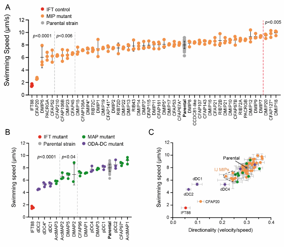 我们进一步利用锥虫寄生虫的遗传可操作性(genetic tractability)以及它们的运动行为易于记录的特点,系统性地测试了每种已鉴定蛋白对寄生虫游动行为的影响。通过 CRISPR 基因编辑技术,我们在 Leishmania mexicana 中分别敲除了这些蛋白。随后,我们使用暗场视频显微镜(dark-field videomicroscopy)测量每个突变体的游动速度和方向性【图 5】。