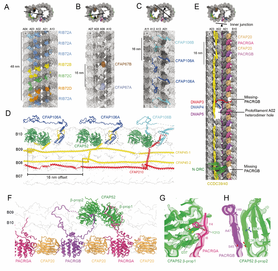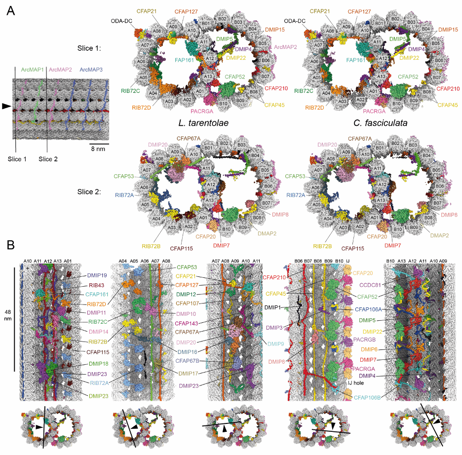结果显示【图 2】,在单个 48 nm 的重复单元中,我们发现了 51 种不同的 MIPs,其中 27 种是锥虫寄生虫或更广泛的 kinetoplastids 特有的 MIPs,此外还发现了一种由五个亚基组成的 dynein-docking complex,以及一类新型的 MAPs,称为 ArcMAPs。