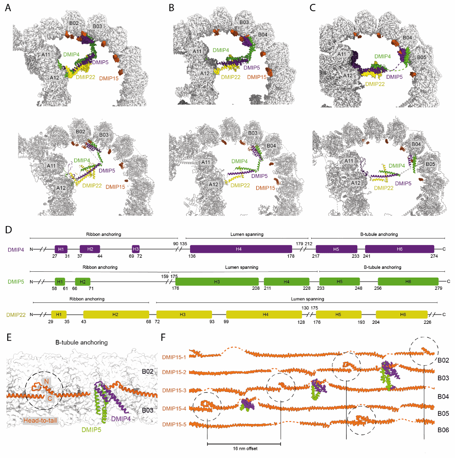 锥虫类 DMTs 的一个特征是 B-微管腔内存在的重复密度结构,这些结构被称为小桥(ponticuli),源自拉丁语。T. brucei DMTs 的 Cryo-ET 和 subtomogram averaging 显示在一个 48 nm 的重复单元内存在 3 个小桥【4】。这些小桥彼此相距 16 nm,并且都连接到 A-微管相同的原丝(A12)。与先前预期的每个小桥对应于不同的微管内蛋白(MIP)不同,我们发现每个小桥实际上都是同一个由 DMIP4、DMIP5 和 DMIP22 组成的三聚复合物形成【图 4】。它们共同形成一个细长的、主要由 α 螺旋构成的复合物。连接螺旋的柔性环提供了必要的可塑性,使其能够跨越 B-微管的多个结合位点。