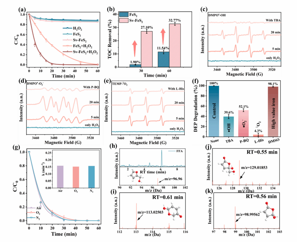 本研究制备了硫空位黄铁矿(Sv-FeS₂),通过提升 H₂O₂ 在活性铁位点的吸附能与界面电荷转移能力,实现 H₂O₂ 在 Sv-FeS₂ 表面无障碍解离。该芬顿体系因此在通过单线态氧(¹O₂)途径降解邻苯二甲酸酯(PAEs)时展现出卓越的催化活性与环境稳定性,达到0.210 min⁻¹的污染物降解速率常数,显著优于FeS₂/H₂O₂ 体系(0.053 min⁻¹)。值得注意的是,Sv-FeS2/H2O2 体系在连续水处理试验中表现出卓越性能,42小时内实现微污染物(5000mL)近100%降解,30分钟内完成4个对数级病原体灭活。总体而言,本研究为铁硫矿物作为非均相芬顿催化剂修复邻苯二甲酸酯类环境污染物提供了极具前景的方案。