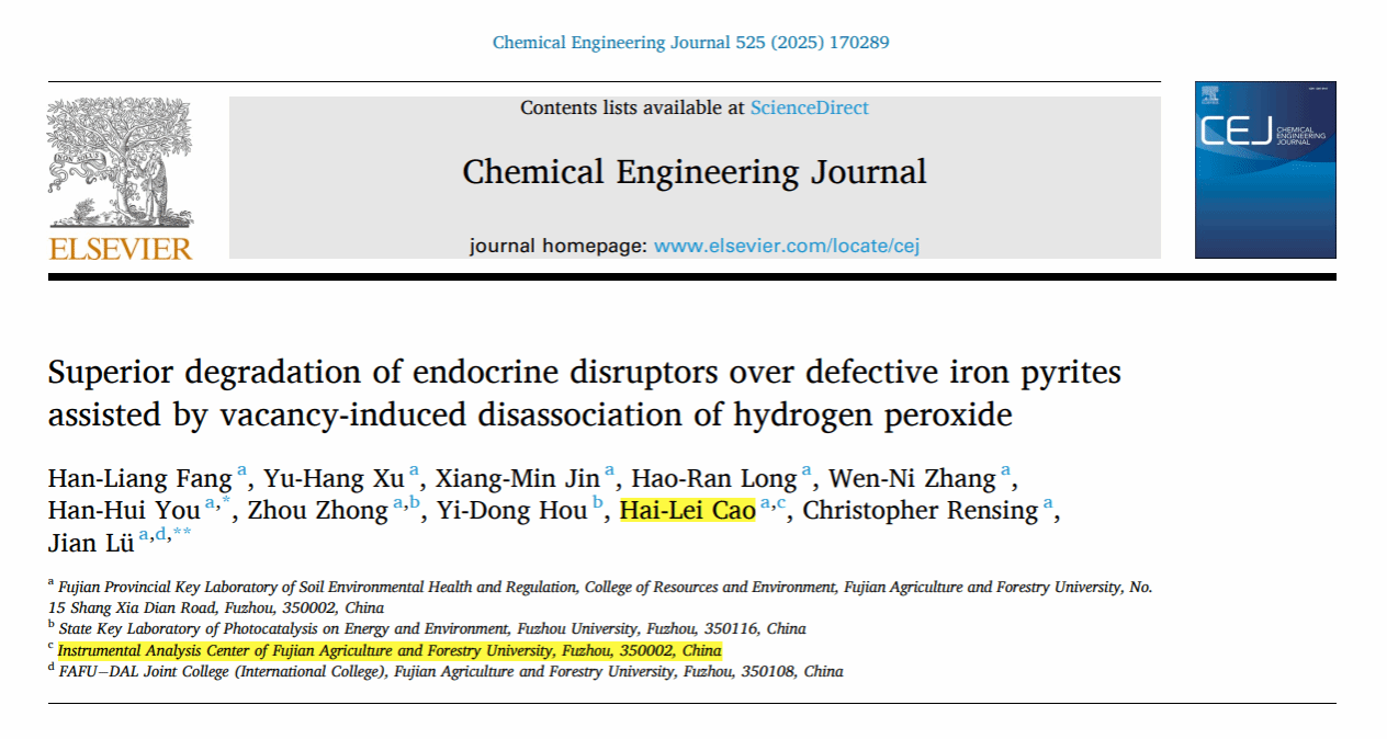 2025年10月,我校吕健教授团队在《 Chemical Engineering Journal 》期刊上发表题为“ Superior degradation of endocrine disruptors over defective iron pyrites assisted by vacancy-induced disassociation of hydrogen peroxide ”的研究论文,为邻苯二甲酸酯类环境污染物降解研究提供了重要科学依据。