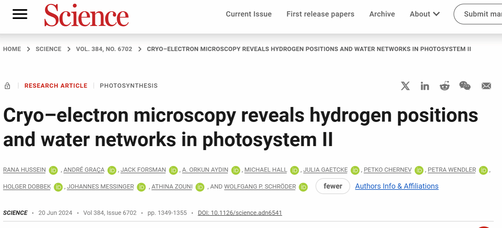 题目: Cryo–electron microscopy reveals hydrogen positions and water networks in photosystem II