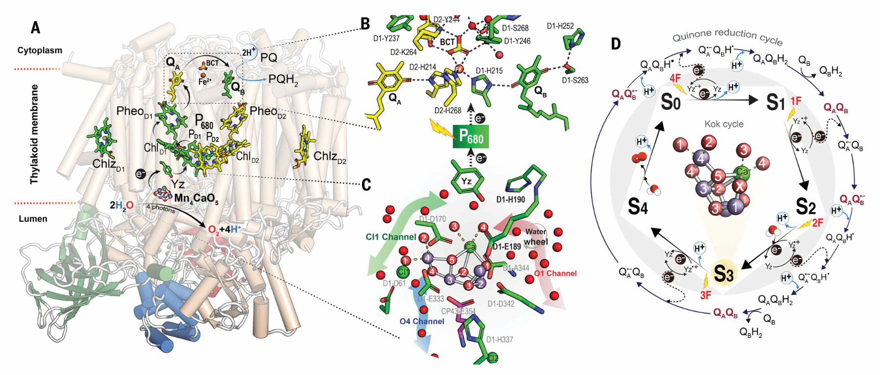 光系统II启动了光合电子传递链photosynthetic electron transport chain,将太阳能转化为化学能,从而维持地球上的生命。同时催化了两种化学反应:水氧化生成分子氧和质体醌还原。对于效率来说,电子和质子传递的耦合,是至关重要的;然而,由于水结合位点不确定,以及缺少实验确定的氢位置,这些过程的分子基础,仍然是推测性的。