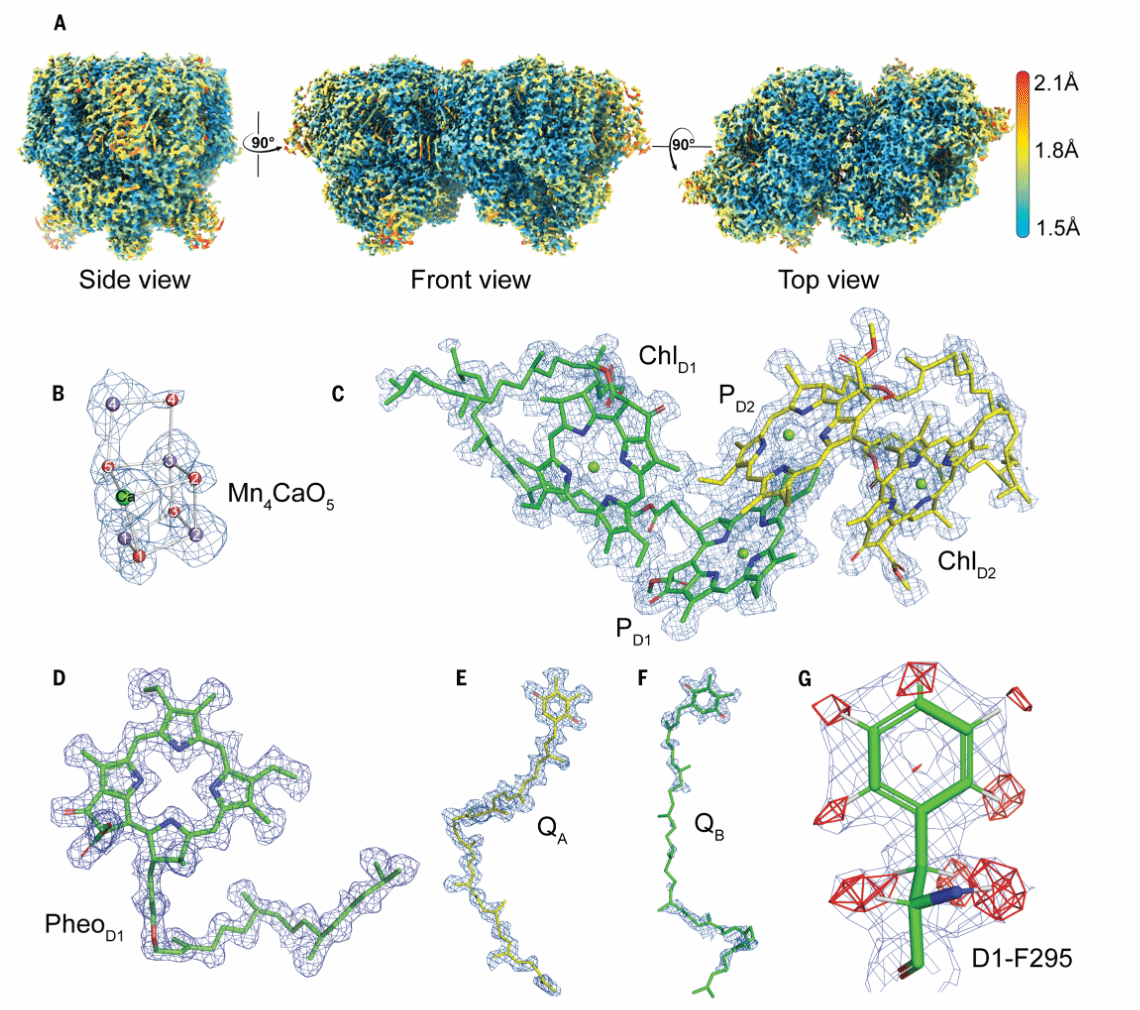 蛋白质复合物光系统II,将大量的辅因子和色素聚集在支架内,并实现了水和质子的运动,这是光合作用过程中,在放氧中心进行的水氧化化学的关键。然而,在X射线晶体结构中识别水分子,特别是质子,通常是具有挑战性该项研究,利用具有不同优点和缺点的低温电子显微镜,以比现有X射线结构更高的分辨率,实验表征了光系统II。通过这种方法,氢原子更加明显,还确定了预期存在的一半以上的氢原子,为这种关键酶的功能,提供了关键的见解。